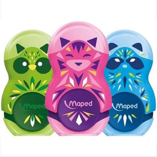 Apontador Com Borracha Loopy Mini Cute Maped possui formato ergonômico e design fofinho, que representa animaizinhos engraçados em cores vivas, o duo apontador/borracha Maped tem tudo para agradar as crianças.