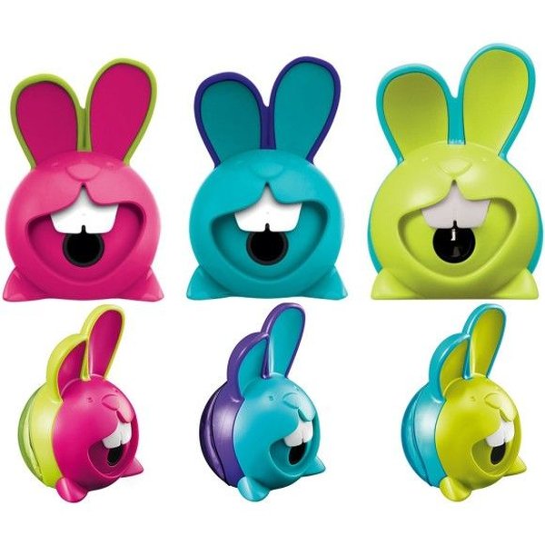 Apontador interativo e com depósito: o dente do coelho se move enquanto o lápis é apontado.