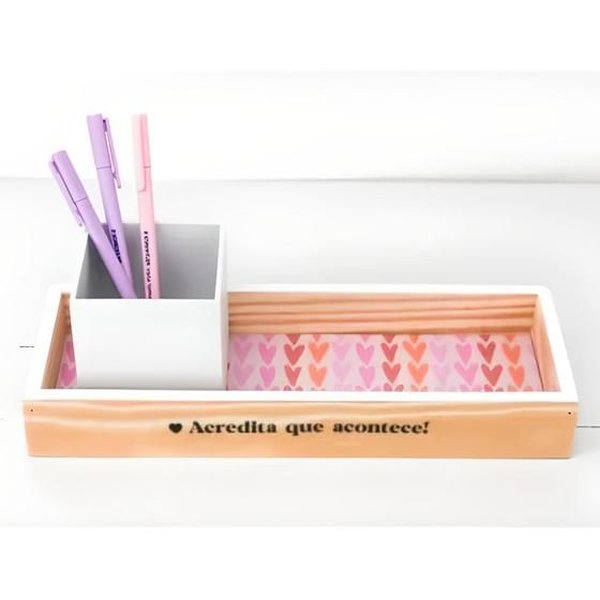 A Bandeja + Porta Lápis é perfeita para quem gosta de deixar o cantinho o mais organizado possível. Além da caixinha para colocar lápis e canetas, na bandeja você consegue organizar todos os outros materiais à fácil acesso e com muito estilo!