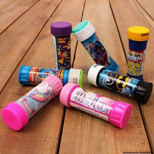 Bolha de Sabão em embalagem plástica com ilustração do temas em cores vivas e de alta resolução.