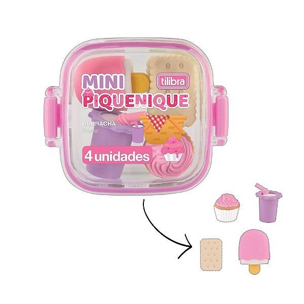 A borracha Lancheira Piquenique da Tilibra é perfeita para quem busca qualidade e diversão. Com formato de doces, este produto encantador vem em um pote com 4 mini borrachas, ideais para uso escolar ou no escritório.