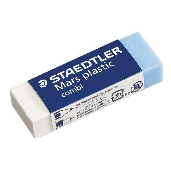A Borracha Staedtler Mars Plastic Combi possui duas utilidades. O lado branco apaga grafite e o lado azul é utilizado para apagar nankim. A borracha Staedtler possui uma ótima qualidade e não mancha os papéis.