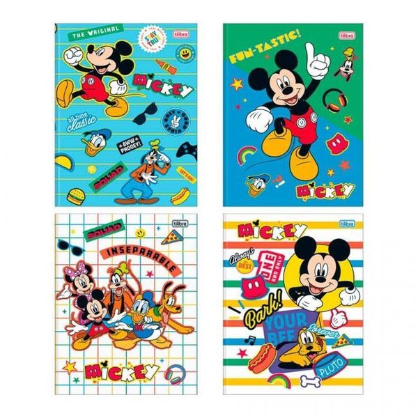 O Caderno Brochura Capa Dura 1/4 Mickey 48 Folhas possui capa dura com a parte interna decorada, folha dupla de adesivos e folhas pautadas. Ideal para o dia a dia na escola.