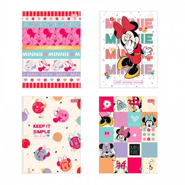 O Caderno Brochura Capa Dura 1/4 Minnie 80 Folhas possui capa dura com a parte interna decorada, folha de adesivos e folhas pautadas.