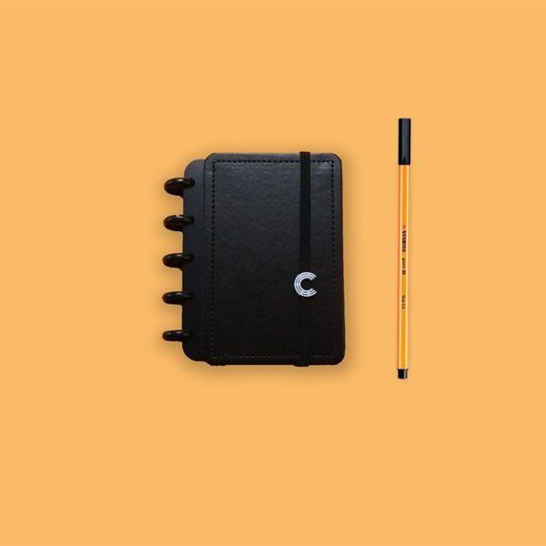 ⋆ A5, Médio ou Grande: Capa e contracapa rígidas, 01 bolsa plástica, 01 folha de instrução de uso e manuseio, com refis e acessórios da marca disponíveis no verso, 01 folha de identificação com calendário no verso, 04 divisórias com abas para identificação (02 pretas e 02 transparentes), 80 folhas offset 90g (60 folhas pautadas e 20 folhas lisas brancas para impressão), 01 suporte com elástico para 01 caneta ou 01 lápis e discos M + elástico.