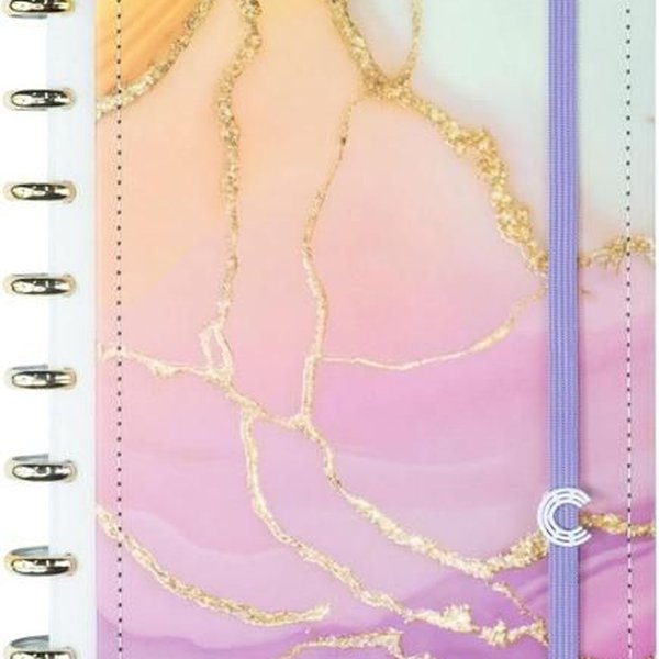O Caderno Aurora é uma explosão de cores suaves, combinando tons de rosa, amarelo, roxo e verde clarinho, que se assemelham a um elegante mármore. Detalhes em dourado adicionam um toque de sofisticação, elevando a experiência de uso.