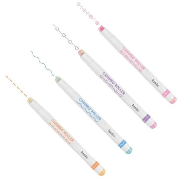 O Carimbo Roller Lunix tem formato de caneta, com tinta à base de água, nas opções de estampas de corações lilás, flores rosas, tracejados laranjas e ondas azuis.