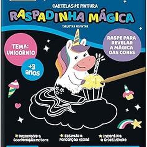 A Raspadinha Mágica oferece uma maneira curiosa e divertida de pintar, incentivando a coordenação motora, a percepção visual e a criatividade. Este produto, com temática de unicórnio, é indicado para crianças a partir de 3 anos. São 6 cartelas pretas, no formato 148x210mm, que ao serem raspadas com o palito de bambu incluso, revelam cores vibrantes.