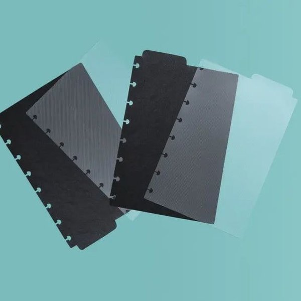 Com duas divisórias em preto e duas transparentes, elas podem ser usadas para dividir matérias, assuntos, semestres e muito mais, e as abas facilitam ainda mais na hora de encontrar o que você está procurando dentro do caderno.
