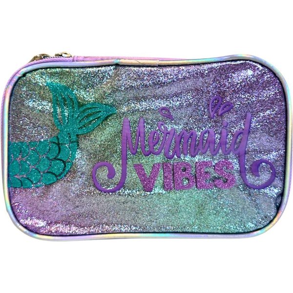 Estojo box confeccionado em poliester acetinado com painel frontal em PVC com glitter e PVC cristal estampado, com divisoria central e elasticos, puxadores de ziper personalizados em metal com logo em baixo relevo e vivo em PVC com efeito holografico.