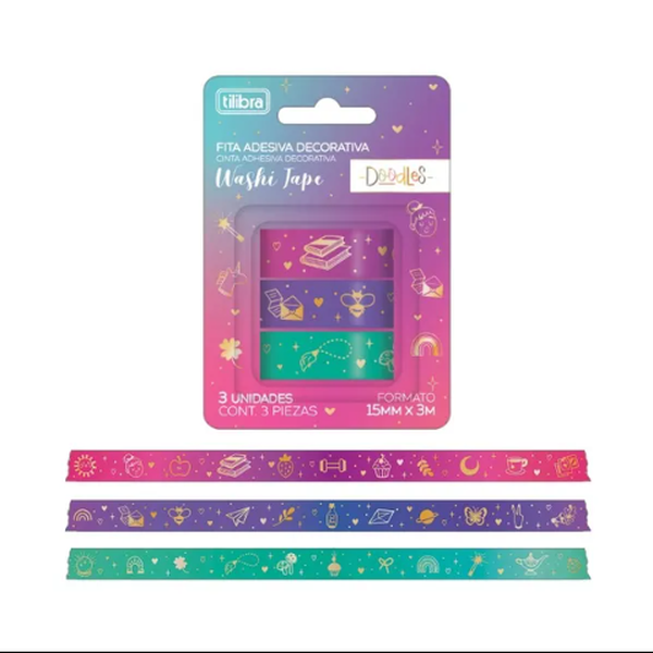 A Fita Adesiva Decorativa Washi Tape Doodles possui 3 fitas 15mmx3m.