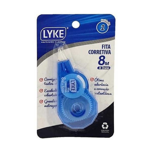 Fita corretiva LYKE de 5mm x 8m, de fácil manuseio, ótima cobertura e secagem rápida.