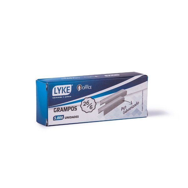 Grampo LYKE no tamanho 26/6, possui tratamento galvanizado, resistente à ferrugem e deve ser armazenado em local seco.