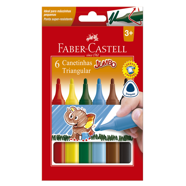 As canetinhas hidrográficas Faber-Castell da linha Jumbo estimulam a criatividade das crianças com a formulação exclusiva de corantes de alta qualidade com cores mais vivas;