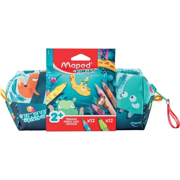 Este estojo de lápis de poliéster com tema de selva contém 12 lápis de cor Jumbo e 12 canetas hidrográficas Jumbo da coleção Jungle Fever