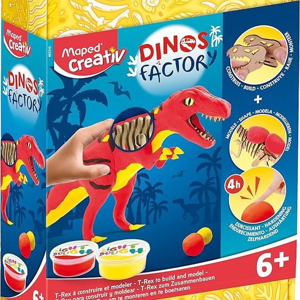 O Kit de Massa de Modelar Dinos Factory faz parte dos passatempos criativos para crianças oferecidos pela Maped. Oferece às crianças uma dupla atividade de quebra-cabeça 3D e modelagem em argila endurecida. Eles montam um quebra-cabeça 3D de madeira numerado para criar seu esqueleto de T-Rex e, em seguida, adicionam massa de modelagem endurecida.