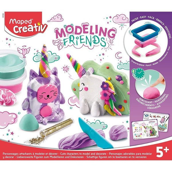Uma gama de pequenos personagens fáceis de fazer com uma forma estilizada e reconhecível. Será muito divertido criar esses Modeling Friends. Tudo é feito de massa super agradável. Depois de algumas horas, tornam-se decorações sólidas, perfeitas para o quarto das crianças.