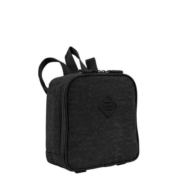 Produzida em nylon, possui alças de costas em cadarço, fechamento com zíper, interior resistente à líquidos, alça carona e alça de mão em cadarço.