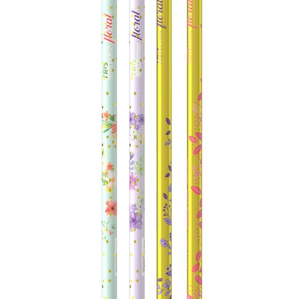 Delicado e com estampas incríveis de acabamento metalizado! Lápis de madeira reflorestada, com traço HB, corpo redondo e borracha no topo.