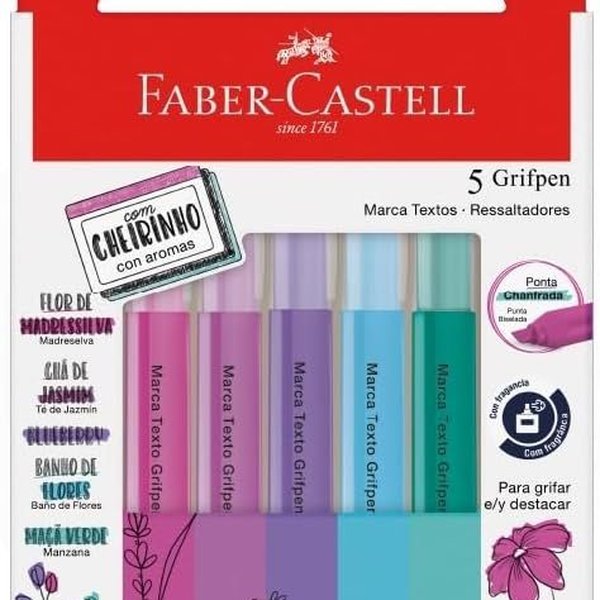 Os marca textos Grifpen Faber-Castell possuem ponta chanfrada em diversas cores com um corpinho triangular ergonômico, trazendo maior conforto ao utilizar. E estas coleções especiais possuem cheirinhos!