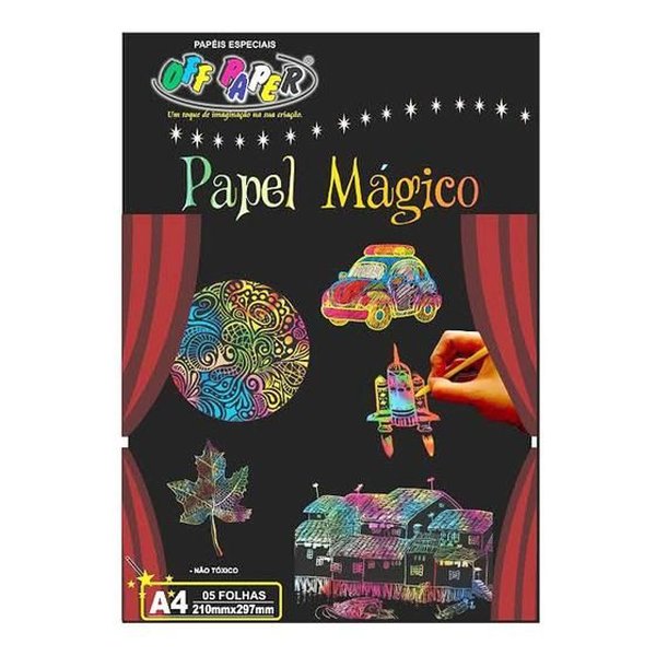 Papel colorido revestido por uma camada preta que permite que você desenhe com o bastão, arranhando a superfície e fazendo com que a criatividade apareça no papel.