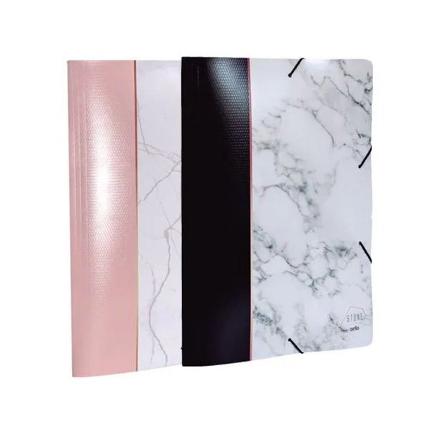 Pasta aba elástico em polipropileno, produzido nas cores preta e rosa claro. Possui abas para fixar os documentos no interior da pasta e elástico para fechamento com terminação em plástico. Produto certificado pelo INMETRO 001548/2013 OCP 0006.