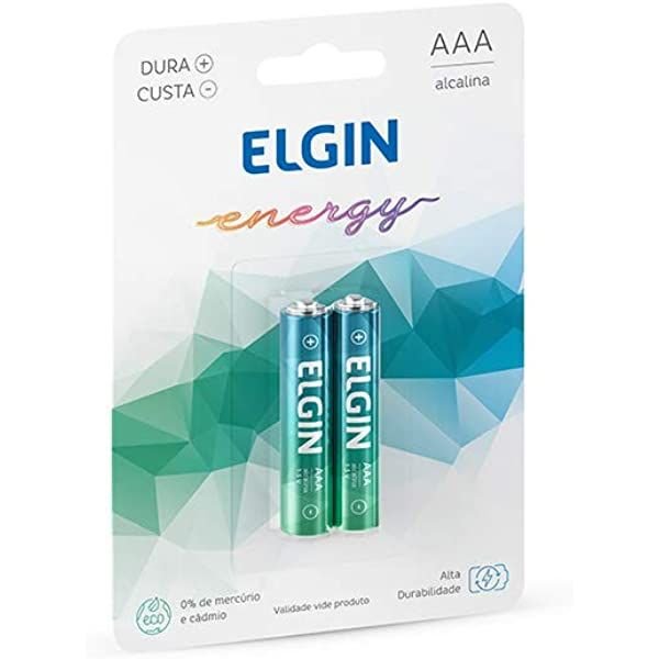 A Pilha Alcalina AA Elgin tem 1,5V de tensão e cada embalagem vem com 2 unidades.